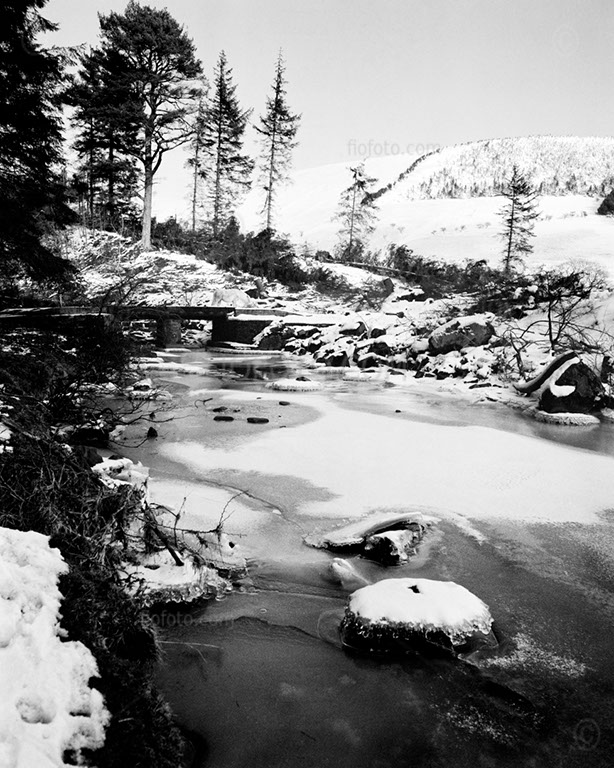Black and white landscape photograph. Winter snow covered landscape. Bannau Brycheiniog (Brecon Beacons) National Park, South Wales, UK.