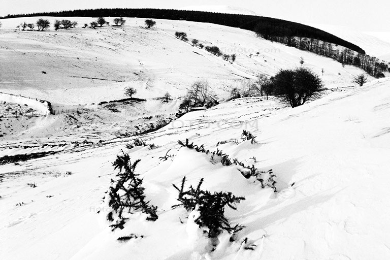 Black and white landscape photograph. Winter snow covered landscape. Bannau Brycheiniog (Brecon Beacons) National Park, South Wales, UK.