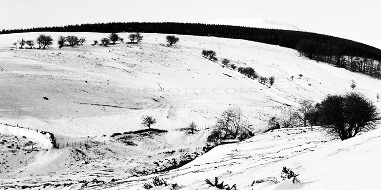 Black and white landscape photograph. Winter snow covered landscape. Bannau Brycheiniog (Brecon Beacons) National Park, South Wales, UK.