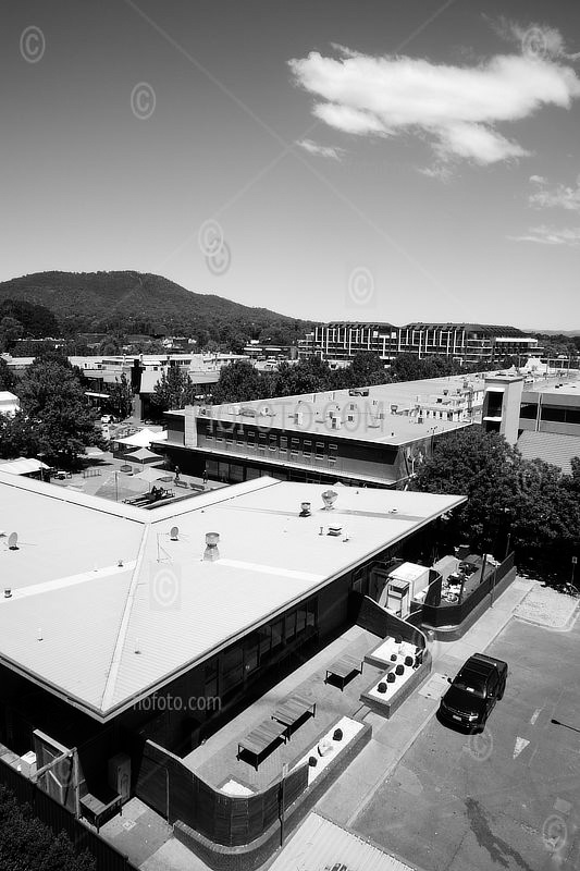 Canberra citys and topographics, Australia. Elevated view over rooftops in Dickson towards the hills at Mount Ainslie in the south east, ACT, Australia.