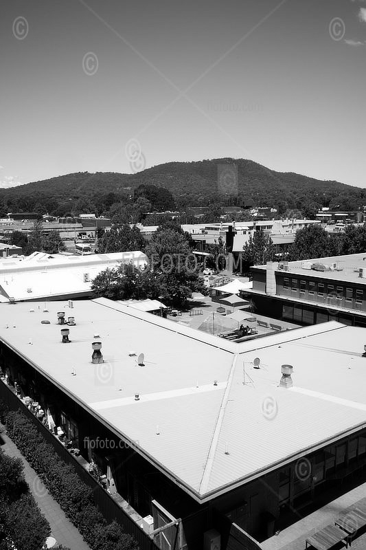 Canberra cityscape and topographics, Australia. Elevated view over rooftops in Dickson towards the hills at Mount Ainslie in the south east, ACT, Australia.