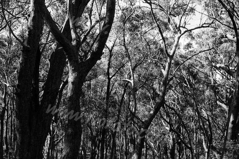 Black and white image showing Gibbergunyah bushland, New South Wales Southern Highlands, Australia