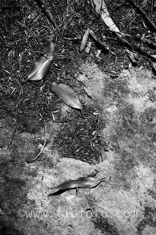Black and white photo of leaf litter on ground. Gibbergunyah bushland, Bowral, New South Wales, Australia
