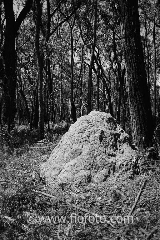 Black and white photo image from the Australian bush showing large termite mound and trees in background.