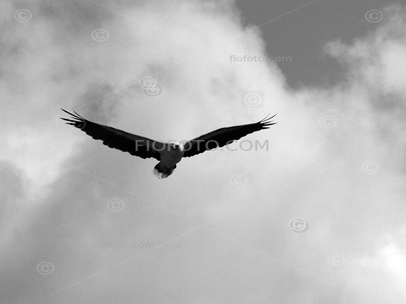 White-bellied Sea-Eagle in flight, hovering. Image shows bird against cloud and sky.